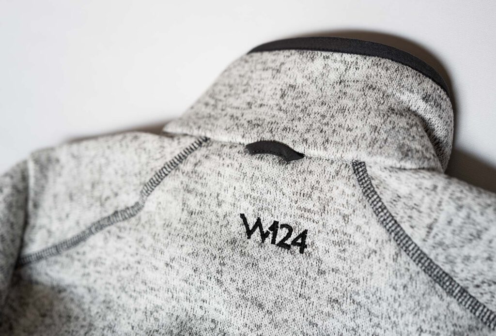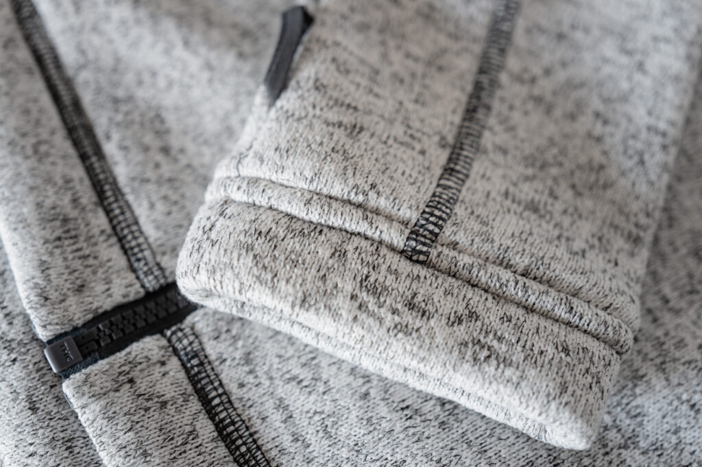 - Doppelnähte an Ärmelbändchen und unterem Saum.
