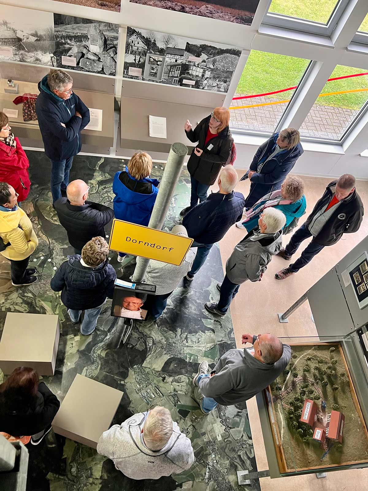 Es gab am Samstagmorgen ein gutes Frühstück im schön gelegenen Hotel „Sonnenhof“ und dann ging’s auf den Vormittagsteil der Tour. Der befand sich noch in Hessen, bevor es dann „rüber“ ging über die Landesgrenze nach Thüringen und in die Stadt Geisa (heute wieder ca. 4.800 Einwohner). Auf dem Weg dorthin hatten wir noch das Vergnügen, eine Gruppe von Traktoren zu überholen, die offensichtlich auch auf einer Ausfahrt waren – mit lächelnden Gesichtern in beiden Gruppen und gegenseitigem Hupen. In Geisa gab’s zuerst die Mittagsstärkung, bevor uns dann die deutsche Geschichte in ihren Bann zog.