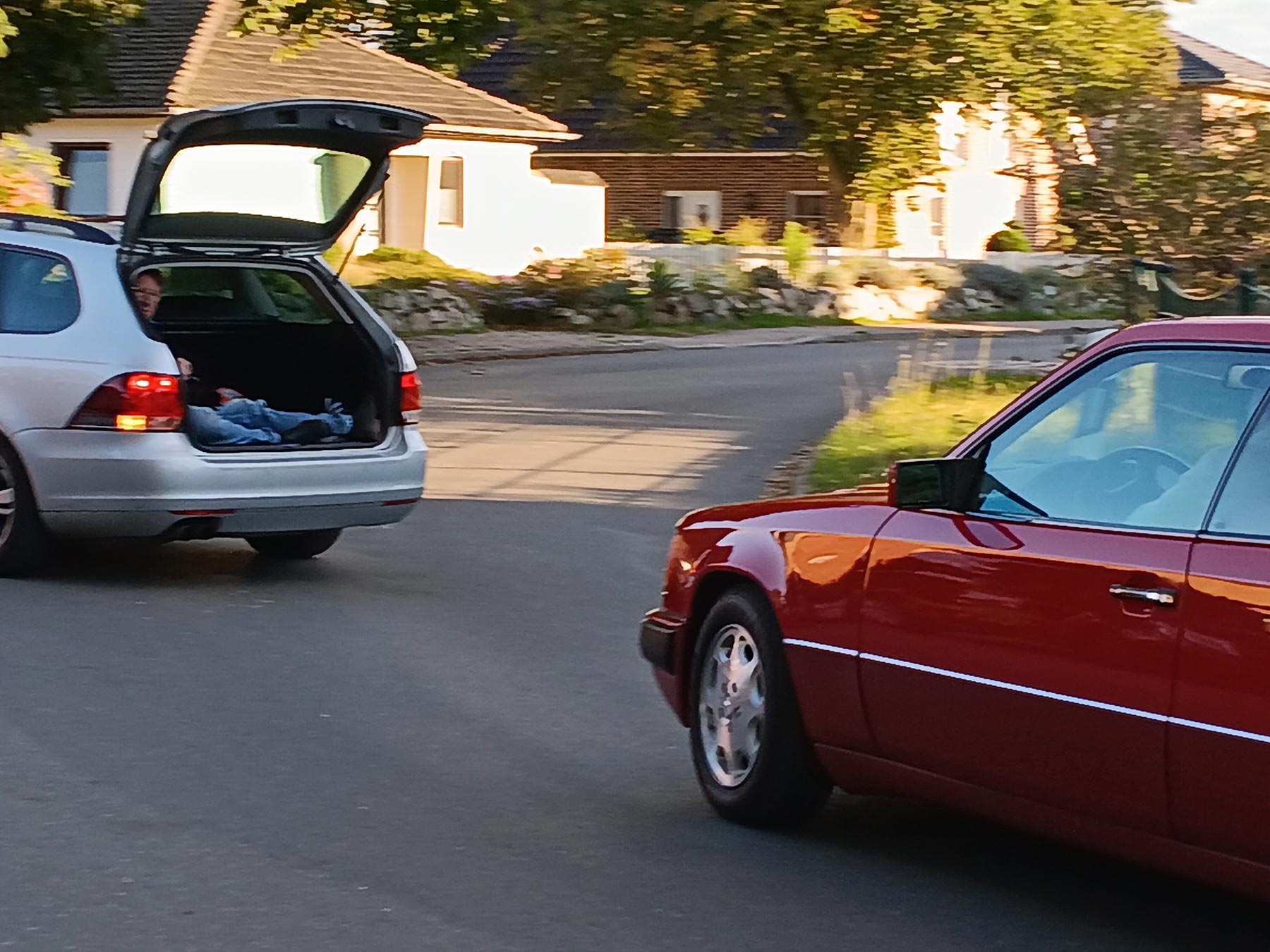 Für die Fahraufnahmen ging es auf die Straße. Hier sorgte die Ansammlung unserer Fotomodelle für einiges Aufsehen. Da ging bei Passanten und anderen Autofahrern so mancher Daumen hoch. Wie Sven bei flotter Fahrt im Laderaum eines Kombis liegend aus der geöffneten Heckklappe heraus fotografierte, nötigte uns schon einigen Respekt ab. Aber wenn es um gute Fotos geht, kennt ein Profifotograf eben keine Furcht.