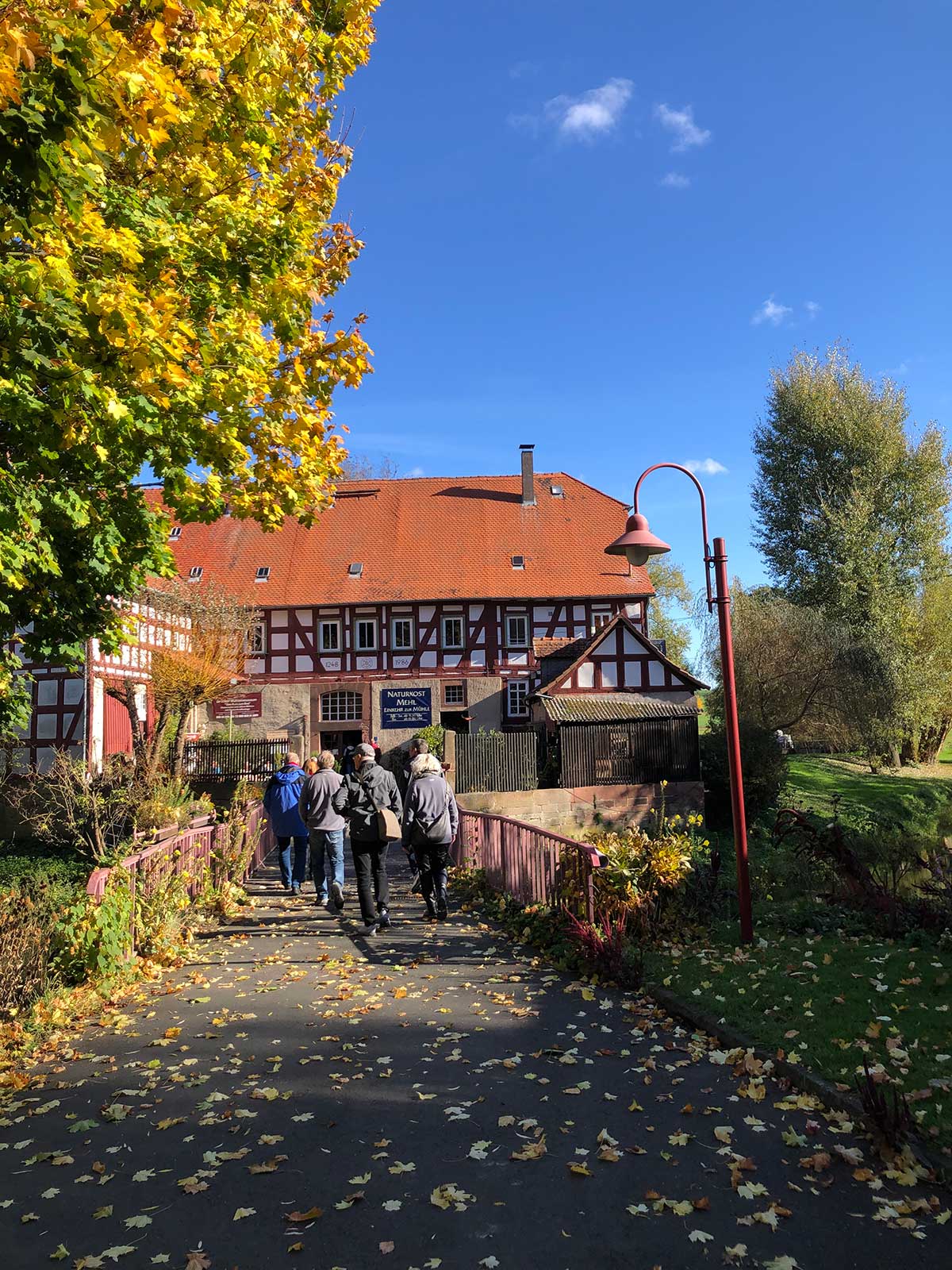 Gestärkt geht es dann weiter durch viele kleine und schöne Orte. Ziel ist die Brücker Mühle mit Mühlenmuseum. Es ist eine historische und aktive Mühle mit Wasserkraft. Um aus dem Getreide, das vom Acker kommt, ein feines, samtweiches Mehl herzustellen, braucht es gestern wie heute zahlreicher Schritte, die uns kaum noch bewusst sind. Die komplexe Technik des historischen Mühlenwesens – von der Stromerzeugung durch Wasserkraft über die Transmission zum Antrieb verschiedenster Maschinen, fasziniert uns und jeden Besucher, ob klein oder groß.
