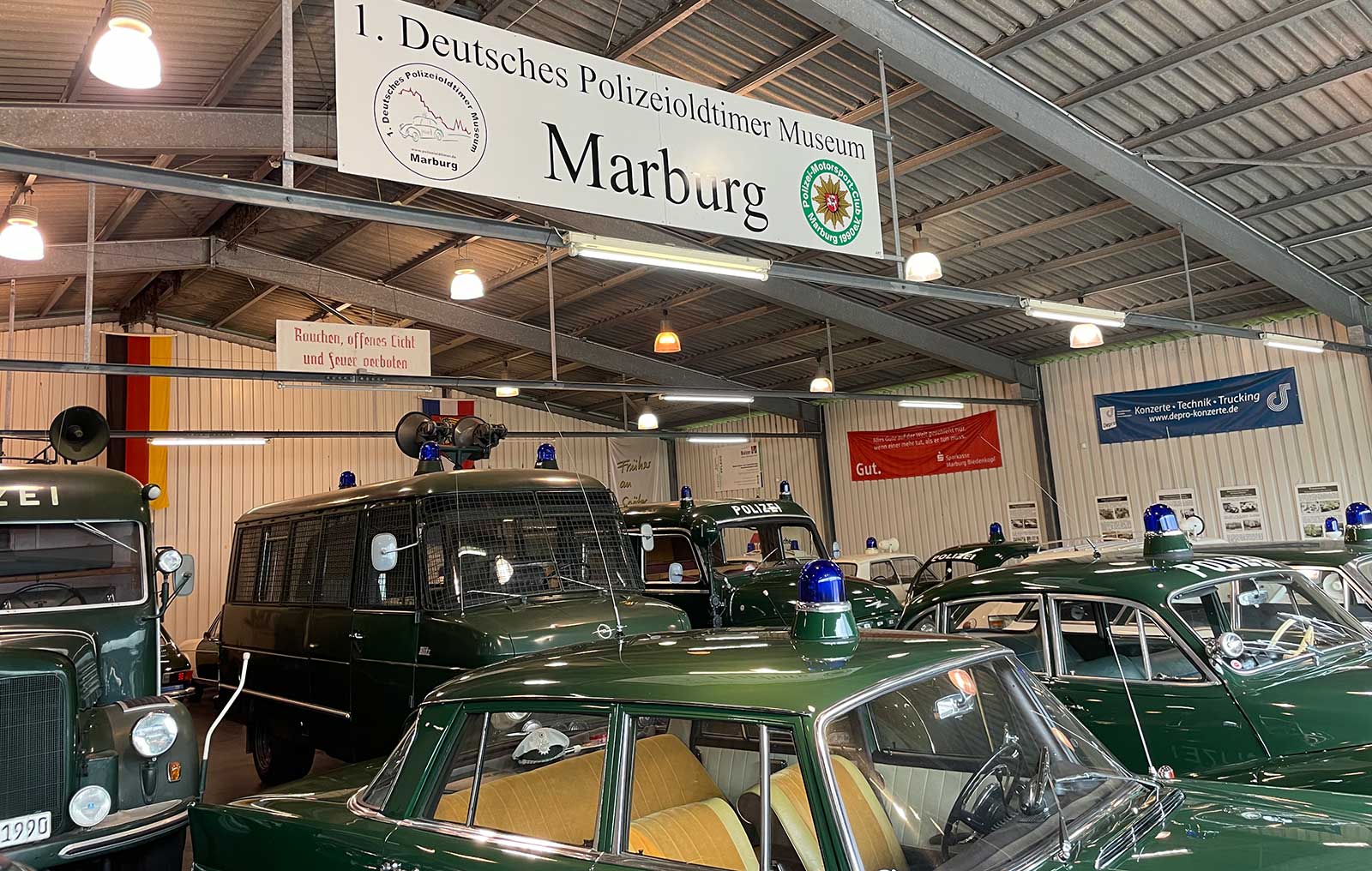 Es geht Richtung Cappel über Landstraßen durch Ronshausen, Hermershausen, Dagobertshausen weiter Richtung Marburg. Unser Ziel heute ist das 1. Deutsche Polizeioldtimer Museum in Marburg, Ortsteil Wehrshausen. Es ist Tag der offenen Tür im Museum. Wir haben einen besonderen Parkplatz mitten auf dem Museumsgelände für unsere W 124er bekommen. Unsere Sterne konnten wir entsprechend aufstellen und werbewirksam für unseren W 124 Club positionieren. Uns erwarten über 120 Oldtimer Polizeifahrzeuge die heute noch teilweise in Film und Fernsehen zum Einsatz kommen. Kleines Manko, es ist noch kein W 124er Polizeifahrzeug im Bestand des Museums (vielleicht beim nächsten Besuch).
